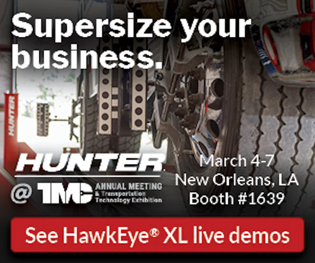 | | | | | | Sponsored | | Hunter’s new HawkEye® XL commercial aligner is designed for maximum speed, durability and ease of use for heavy-duty, medium-duty and light-duty vehicles. XL features extra-long-range camera technology, allowing shops to view three axles live and providing accurate measurements in four minutes or less. See a live demo at TMC next month! |